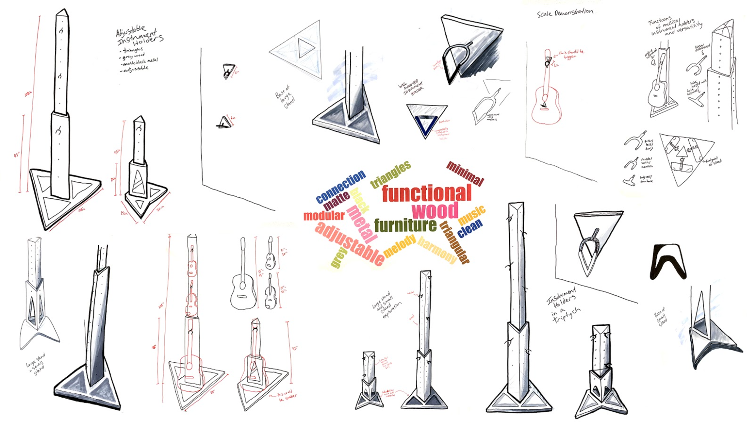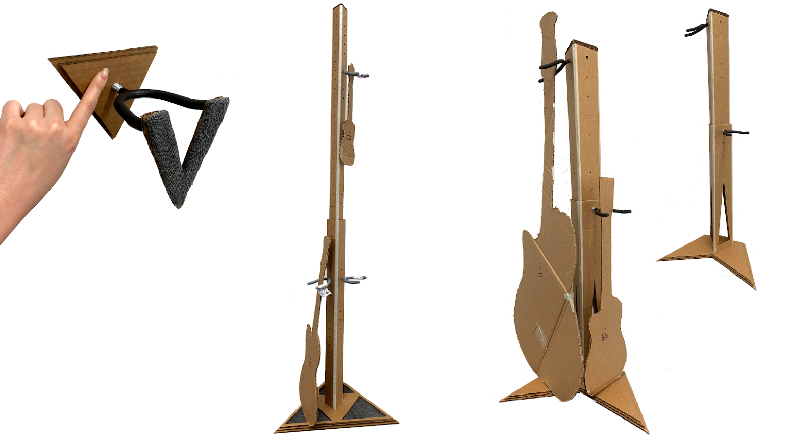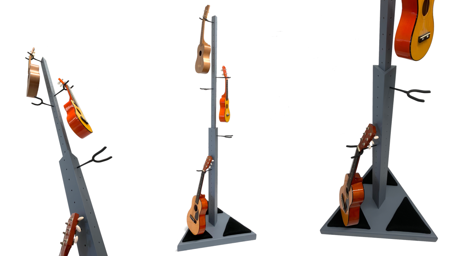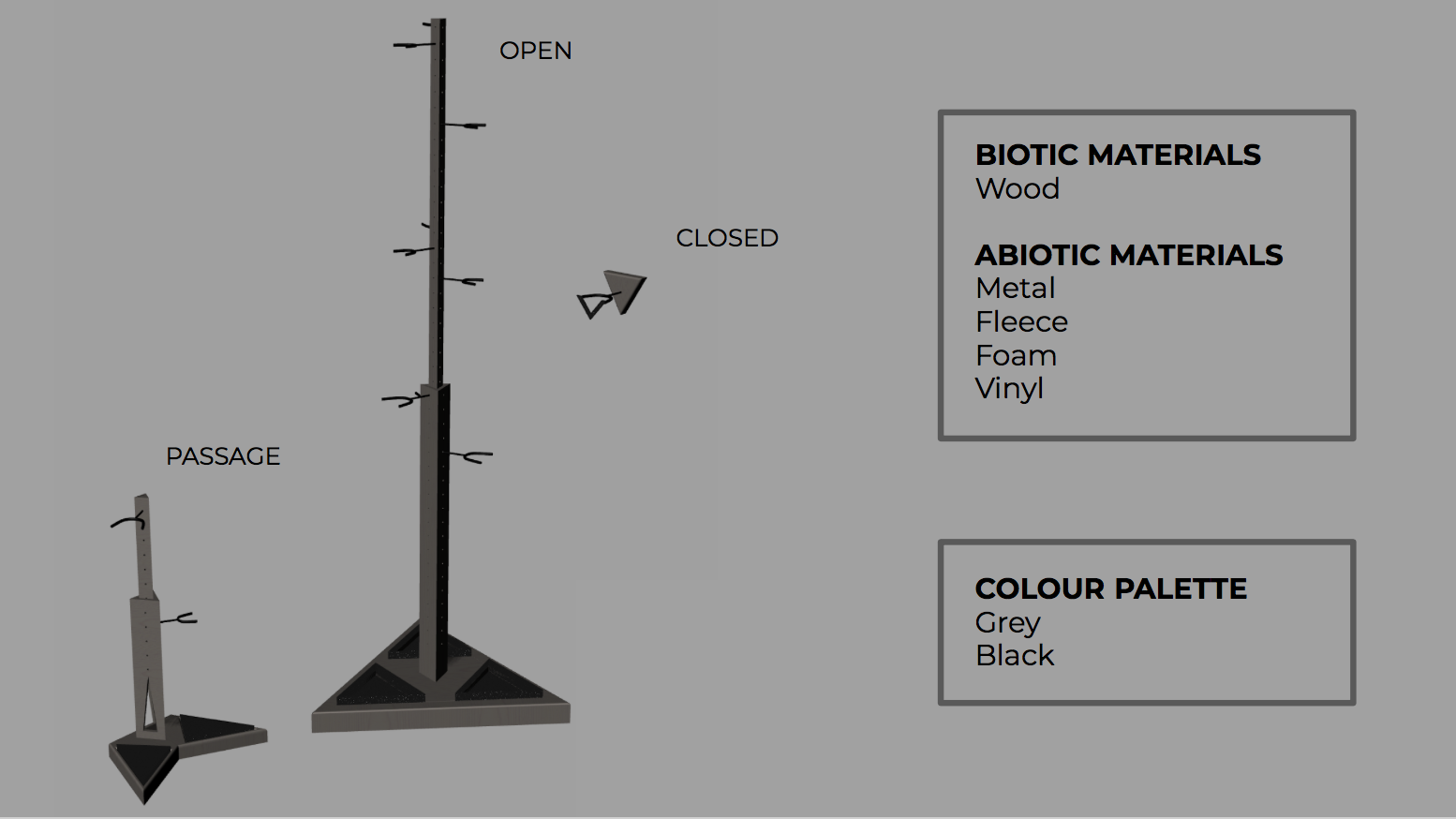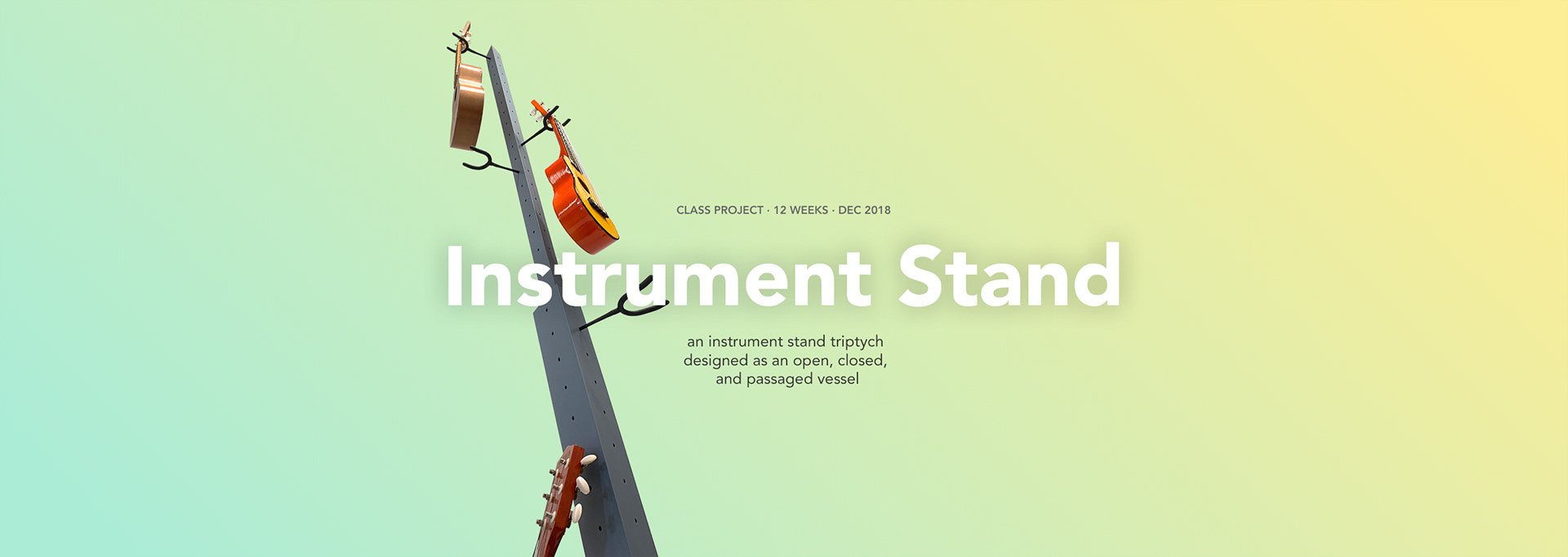 An instrument stand triptych designed as an open, closed, and passaged vessel that must include at least one biotic and one abiotic material. The colour palette must be black, grey, or white. Pictured here is the largest stand, which is adjustable from 5 to 9 feet tall and can hold up to nine instruments.