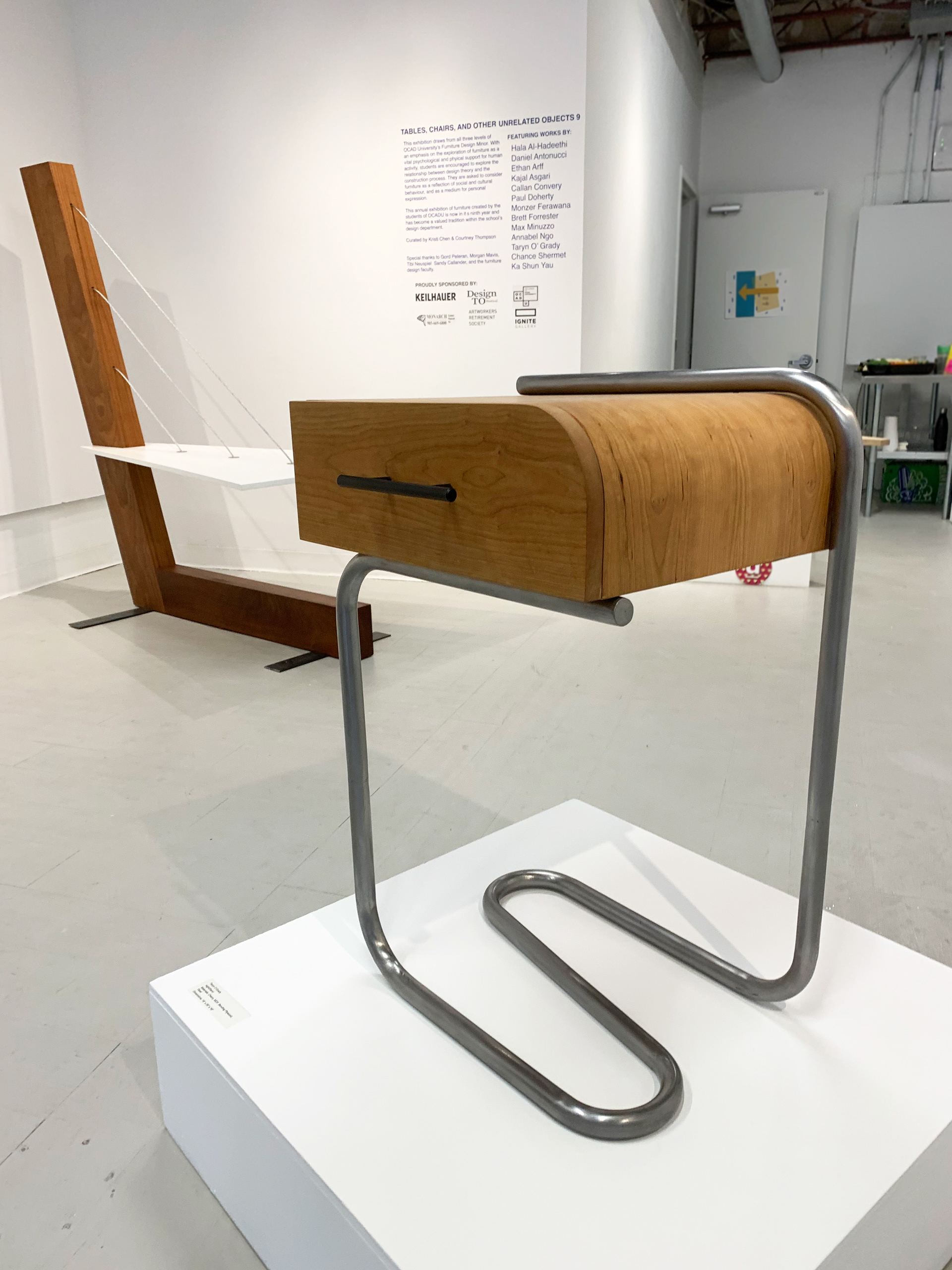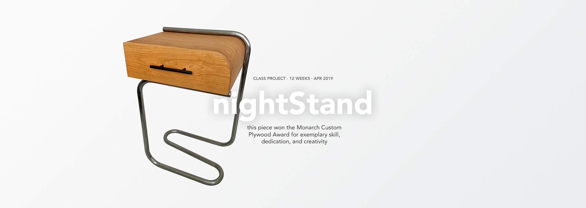The 'nightStand' was created to explore the creation of a drawer with legs. Explorations in fabrication techniques included veneer lamination, the creation of wooden drawer rails, and the combination of materials to create a functional yet playful piece. At first glance the cabinet appears to float effortlessly within the metal base. The curves created by bent laminated wood in combination with bent steel help the two distinct materials form a consistent design language. This piece won the Monarch Custom Plywood Award for exemplary skill, dedication, and creativity.