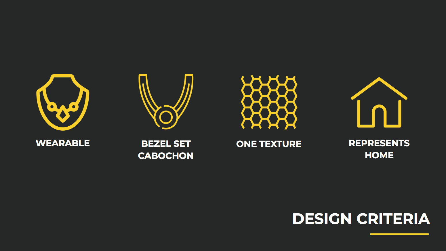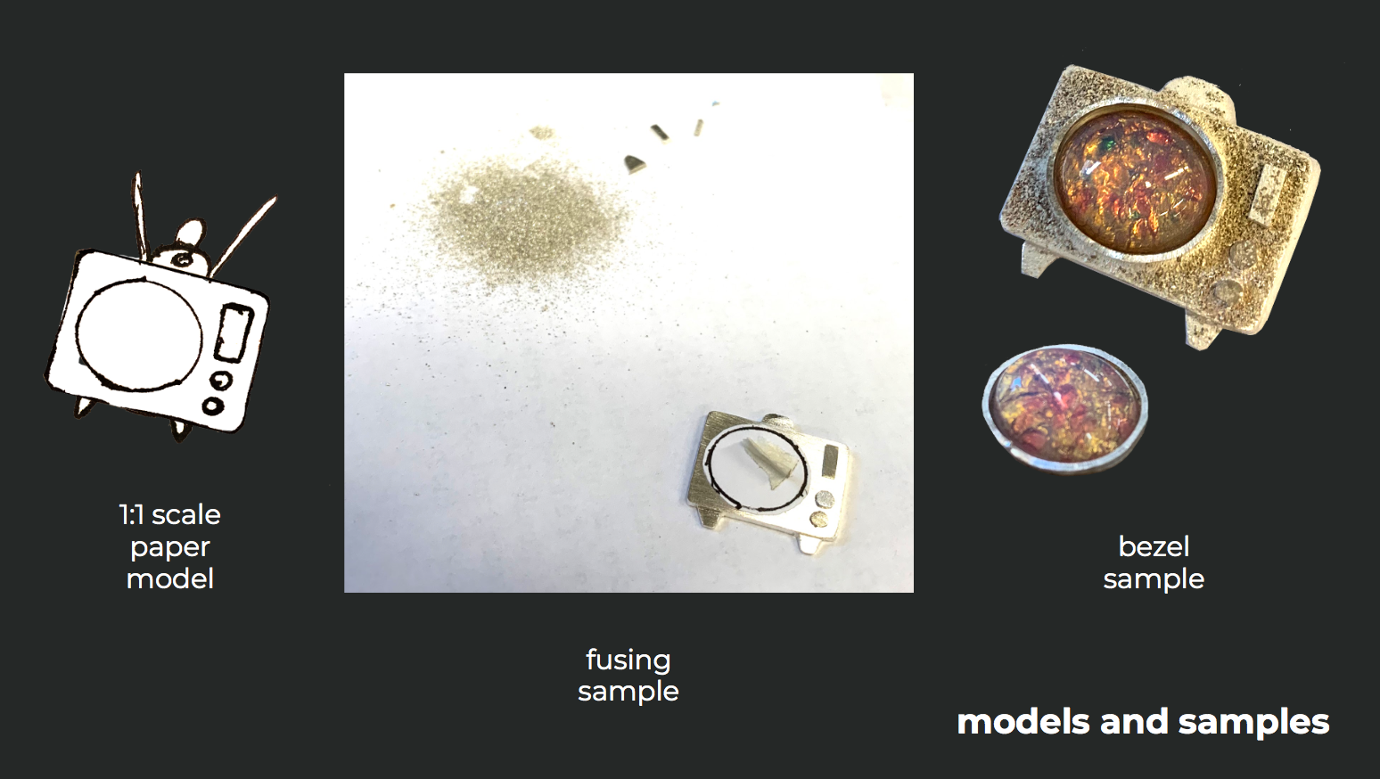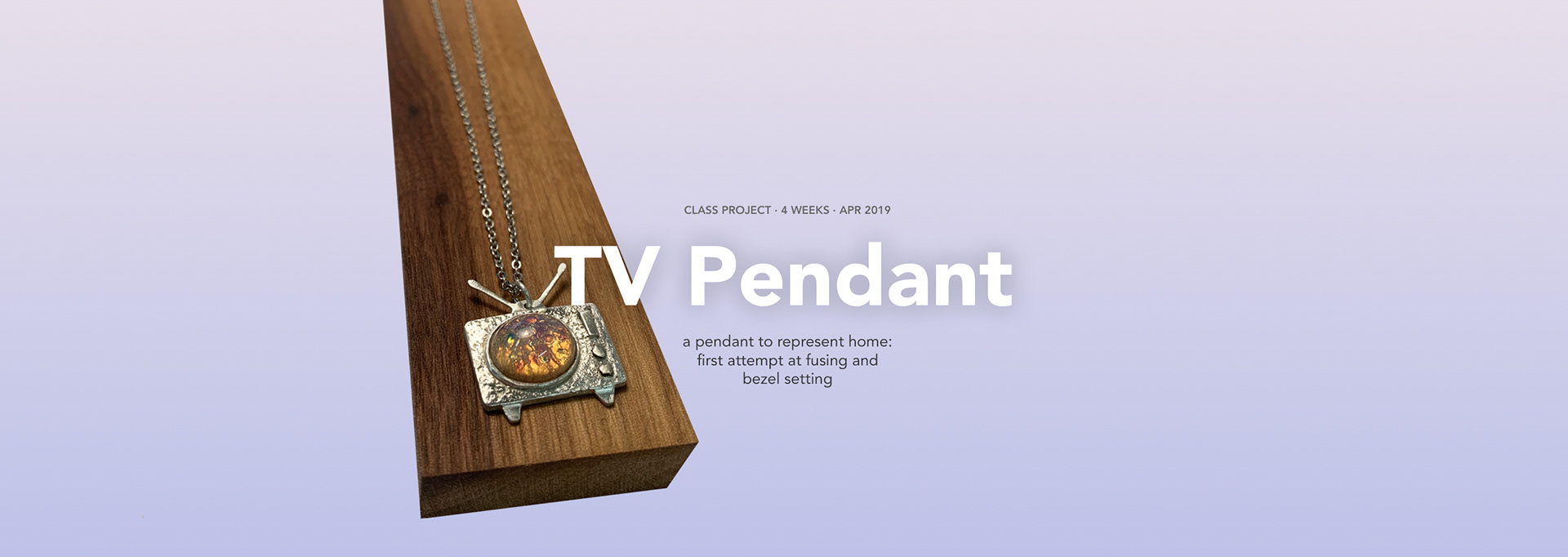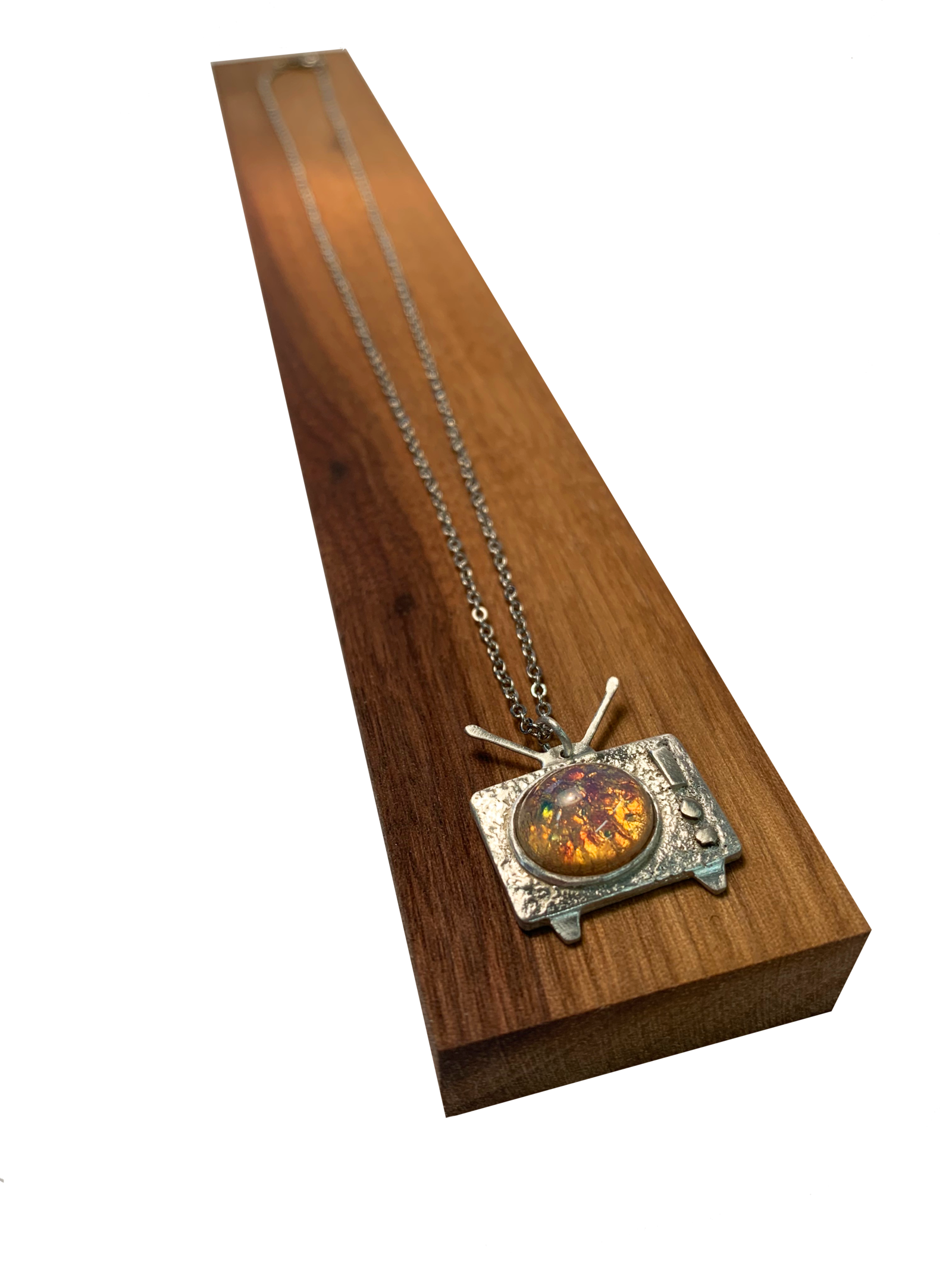 This necklace was made in the shape of a TV to represent 'home'. I chose to use a synthetic opal for the screen of the television because it has visual interest, texture, and multiple colours that represent the movement and colours that can be seen on a TV screen. This was my first attempt at bezel setting and fusing.